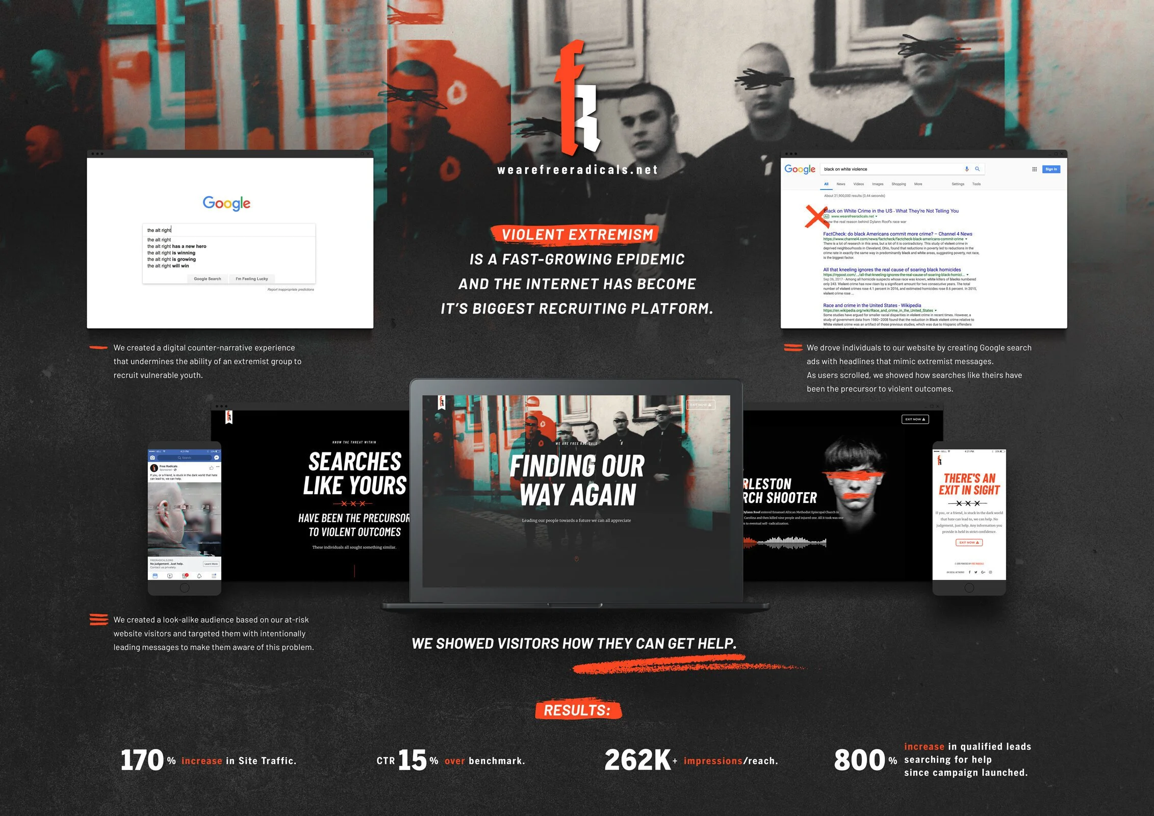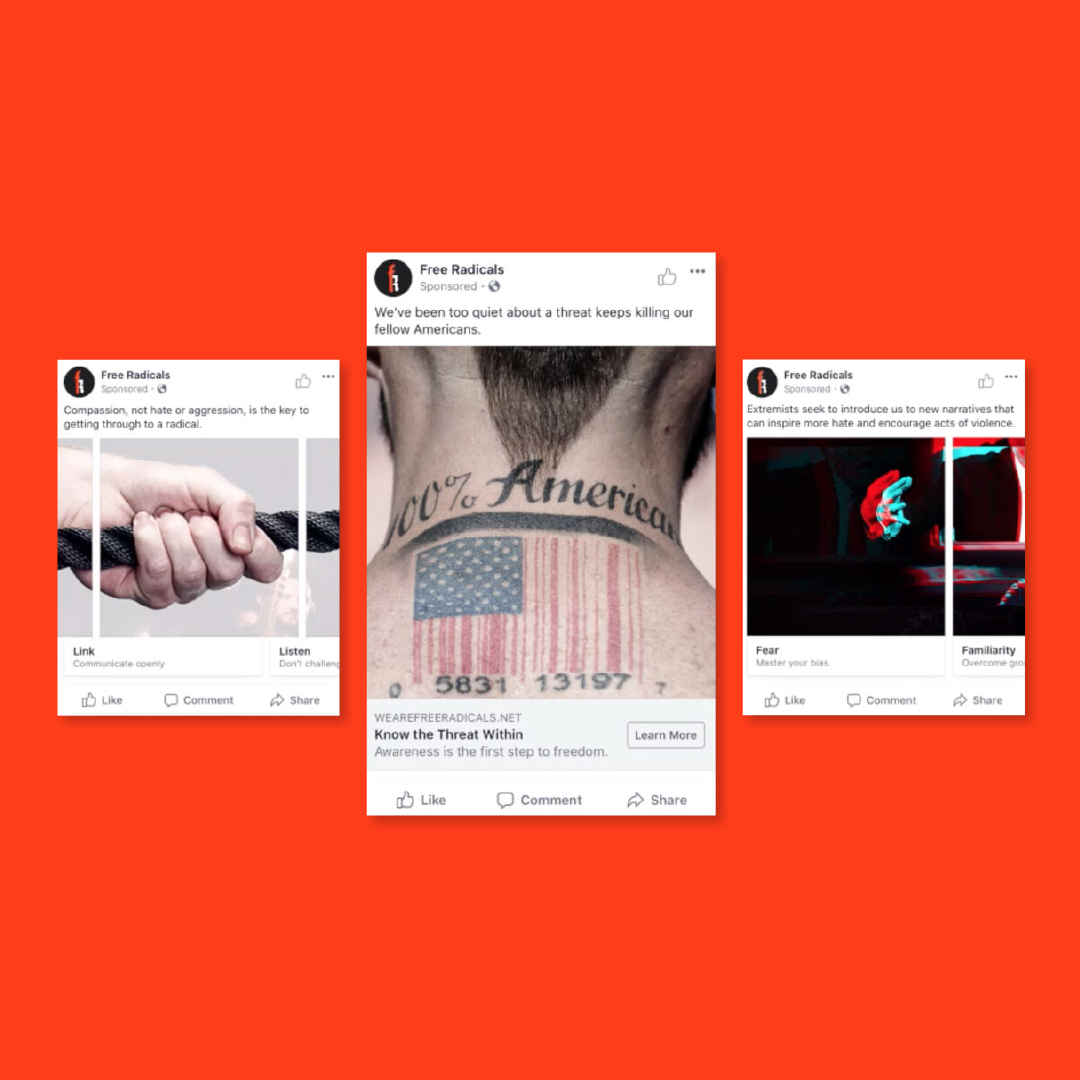 Free Radicals was a digital intervention campaign developed in partnership with Christian Picciolini’s platform, WeAreFreeRadicals.net. Using Google Search Ads, the campaign intercepted individuals vulnerable to extremist content by mirroring the language of real extremist searches and redirecting users toward credible, fact based alternatives.