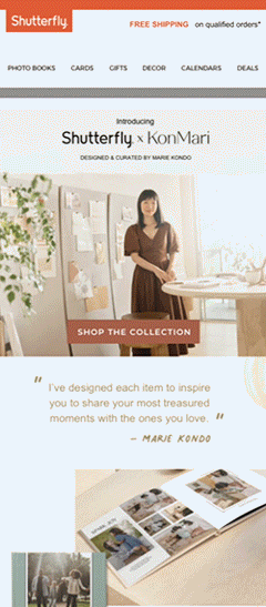 The Shutterfly x KonMari campaign came to life across email, on-site banners, and social platforms, creating a cohesive digital experience that reflected Marie Kondo’s calm, intentional aesthetic.