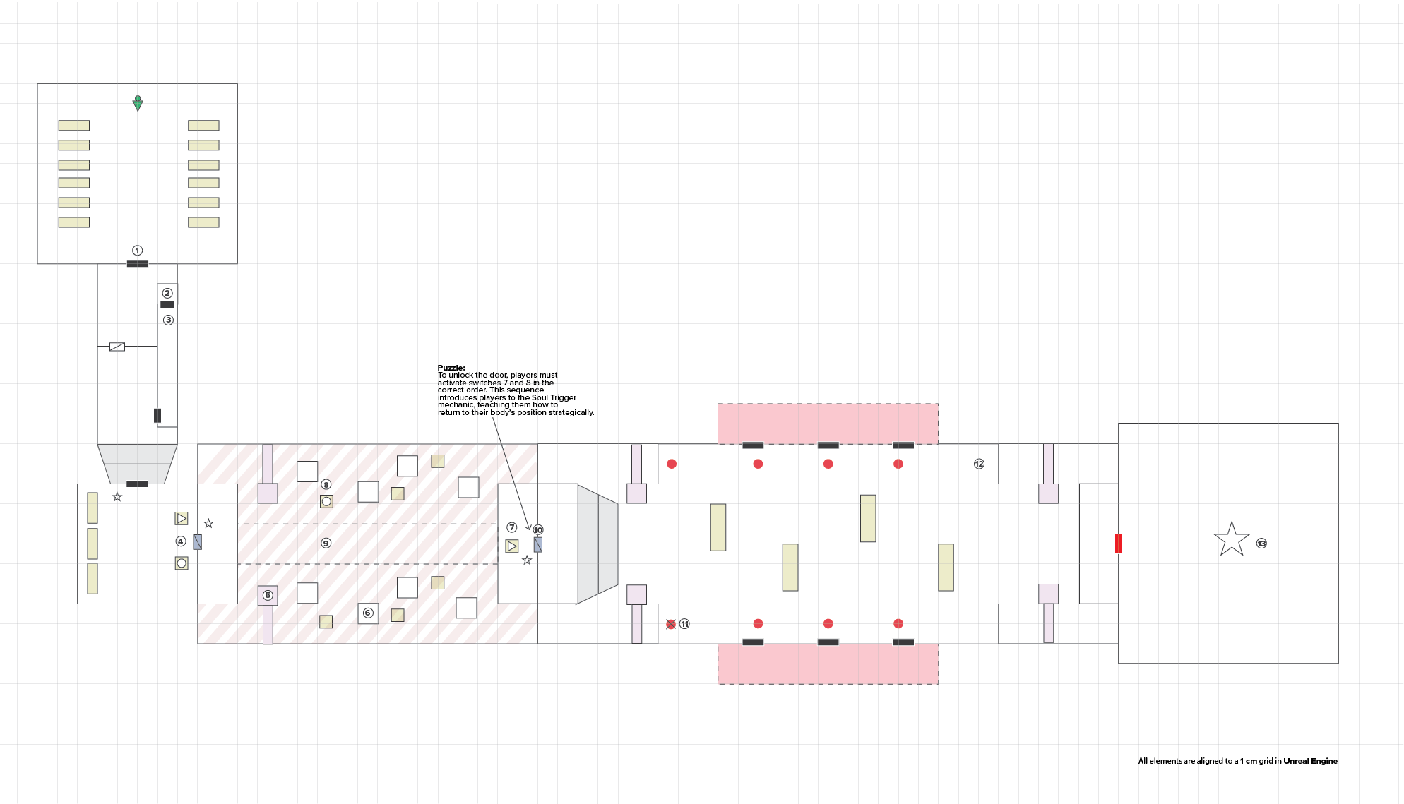 This sketch guided the blockout process in Unreal Engine and ensured that every mechanic in the vertical slice was tied to a clear gameplay teaching moment.