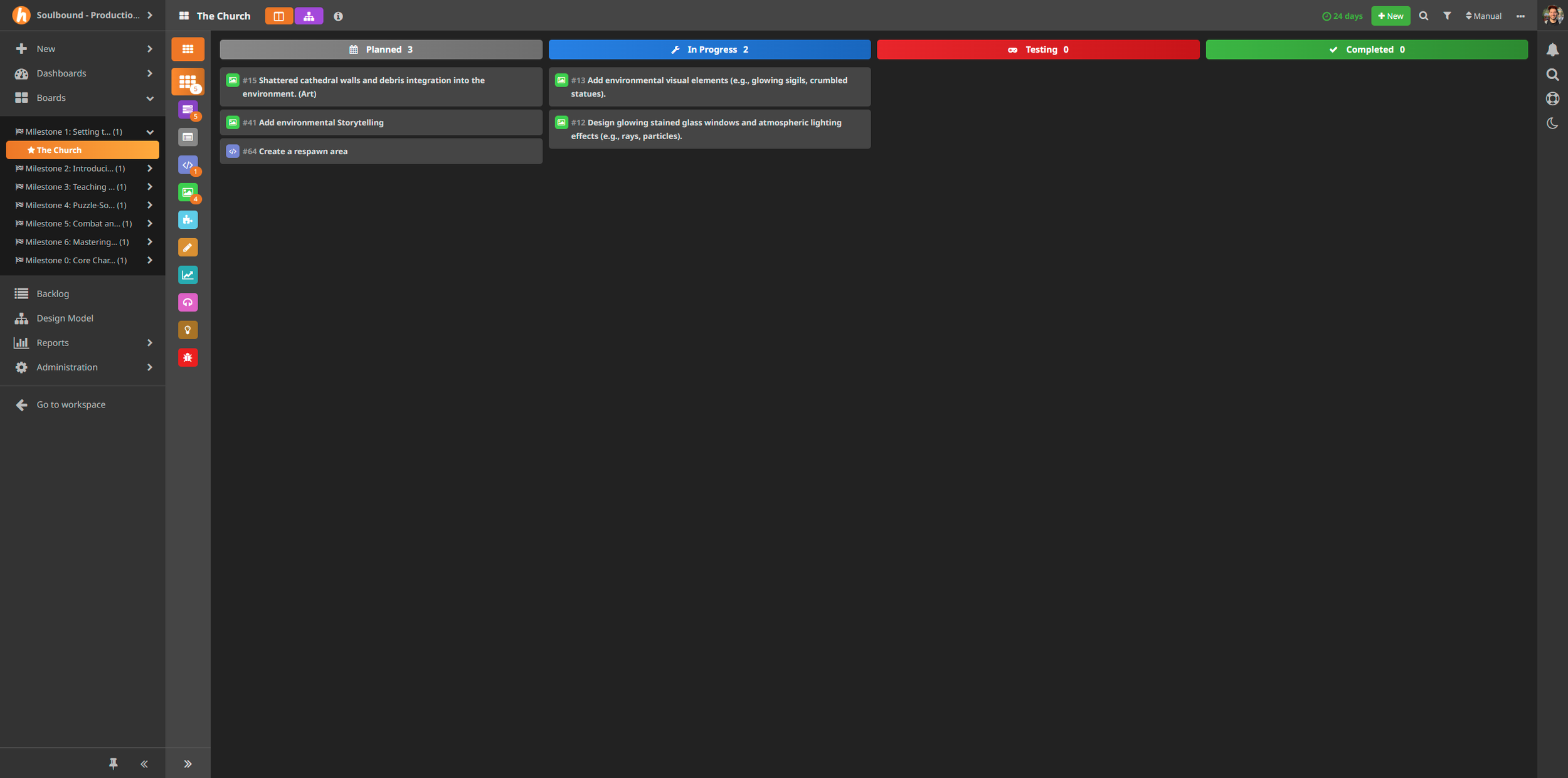 To keep the project organized, I created a production plan using HacknPlan, a tool designed specifically for game development. This allowed me to break the work into clear milestones and manage tasks across the different stages of development.